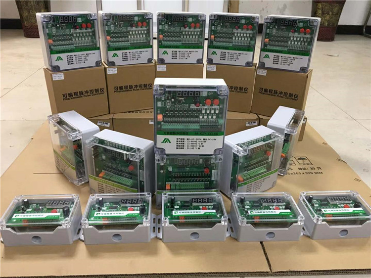 按功能鍵,指示燈 前面的數(shù)字1、2、3、4分別代表相應(yīng)的項(xiàng)目設(shè)置,后面的數(shù)字表示相應(yīng)項(xiàng)目下設(shè)置的值。一般情況下輸出路數(shù)是幾路就設(shè)置成幾路,脈沖周期設(shè)置為5分鐘,脈沖間隔設(shè)置30秒,脈沖寬度設(shè)置為0.1秒。脈沖控制儀輸出一個電信號持續(xù)時間稱為脈沖寬度。控制儀輸出連續(xù)兩個電信號之間的間隔時間稱為脈沖間隔。一個脈沖到一個脈沖之間的停止時間稱為循環(huán)間隔??刂苾x可以根據(jù)清灰要求,調(diào)整脈沖寬度和脈沖間隔,對除塵器進(jìn)行循序巡回定時清灰??刂苾x由高性能微處理器(CPU),控制集成電路,LED數(shù)碼顯示,光電隔離環(huán)節(jié),大功率晶體管驅(qū)動等組成,工作穩(wěn)定可靠,外殼采用優(yōu)質(zhì)工程防水塑殼。本系列控制儀可在1-96路任意選擇輸出,亦可根據(jù)實(shí)際需要設(shè)計特殊規(guī)格的控制儀。