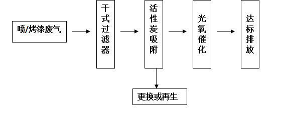 根據(jù)我公司大量處理該類廢氣的經(jīng)驗(yàn),最有效的方法是吸附法與光氧催化的綜合治理,根據(jù)維修企業(yè)的實(shí)際情況,綜合考慮各因素,采取以下治理工藝: